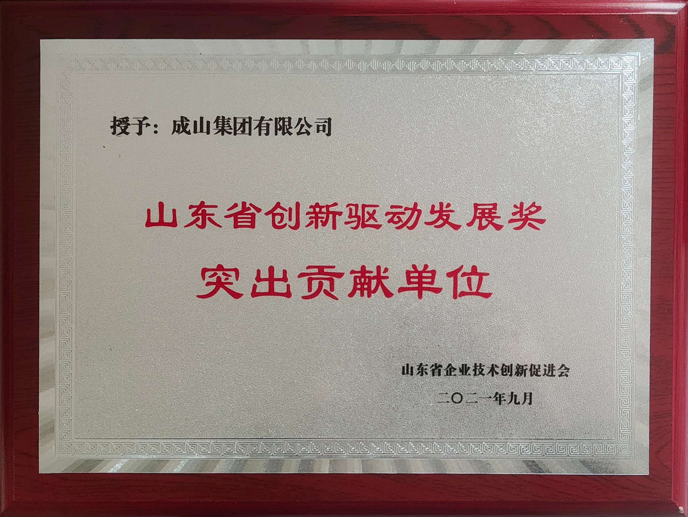 山東省創(chuàng)新驅動發(fā)展突出貢獻單位獎
